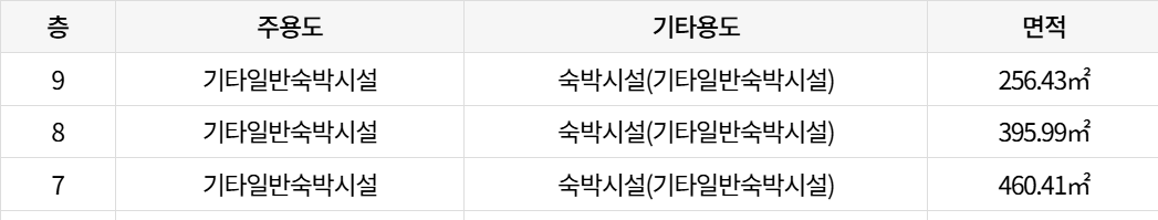 | 9 | 기타일반숙박시설 | 숙박시설(기타일반숙박시설) | 256.43㎡ 77.57평 |